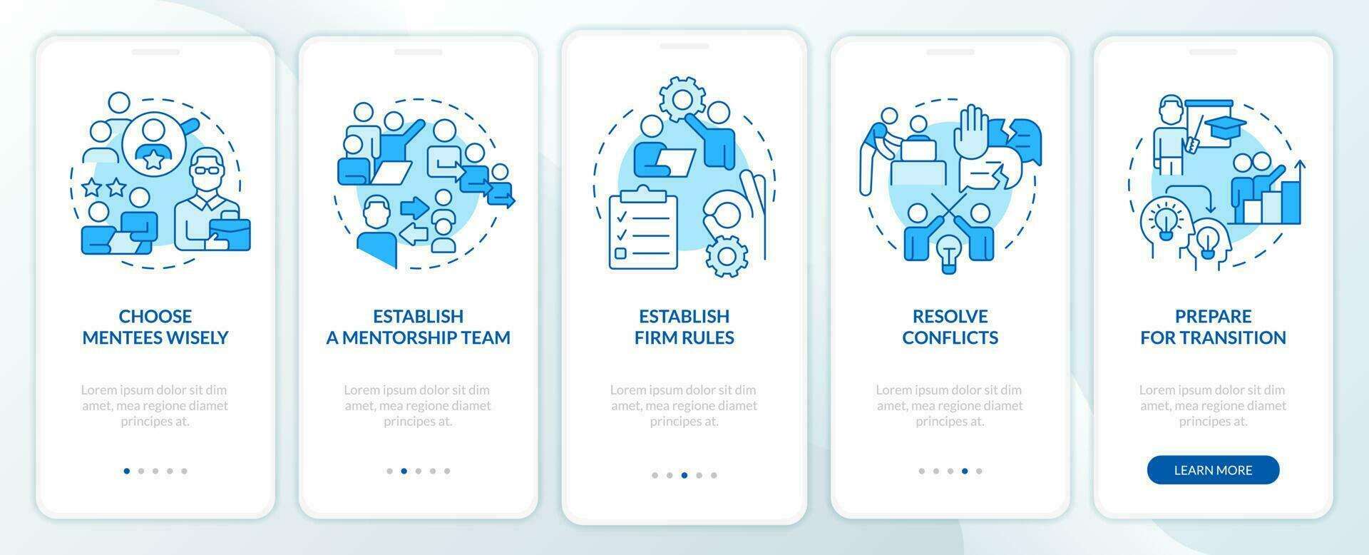 Coaching tips blue onboarding mobile app screen. Resolve conflicts walkthrough 5 steps editable graphic instructions with linear concepts. UI, UX, GUI template Pro Vector and Pro SVG