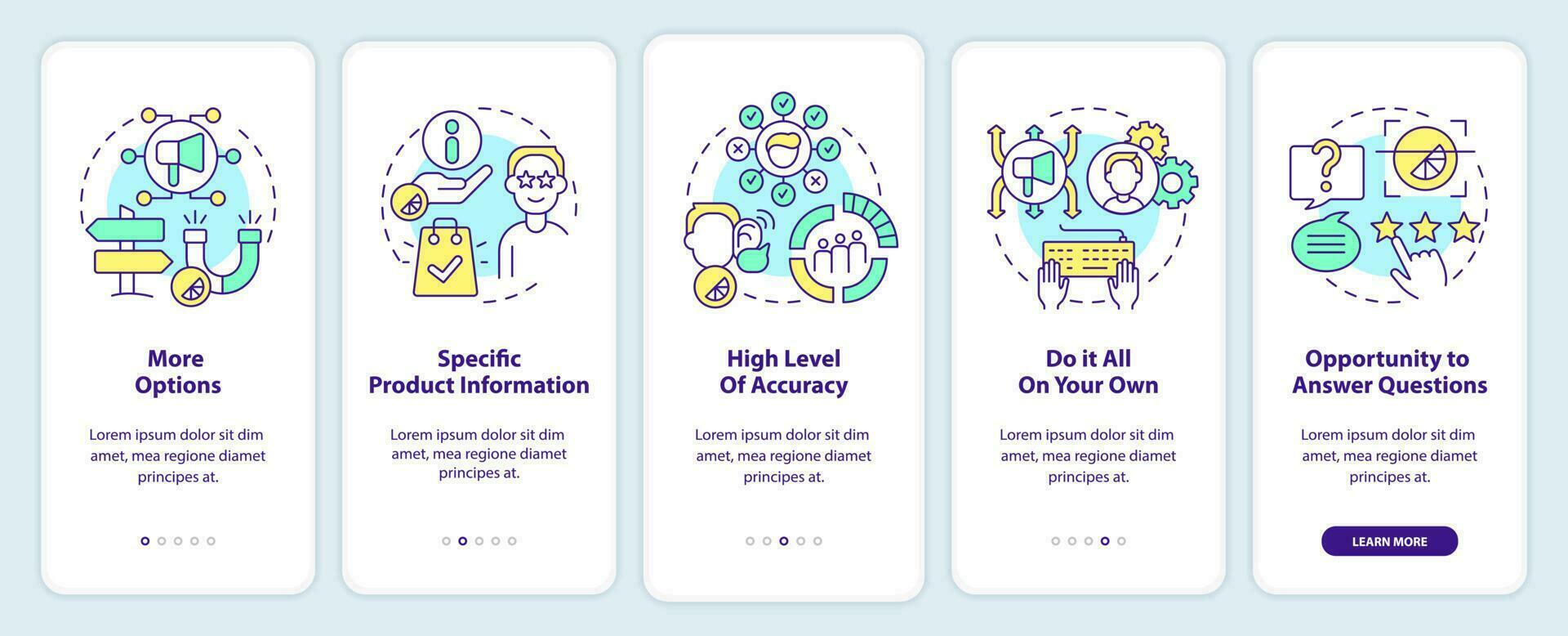 Pros of direct marketing onboarding mobile app screen. Benefits walkthrough 5 steps editable graphic instructions with linear concepts. UI, UX, GUI template Pro Vector