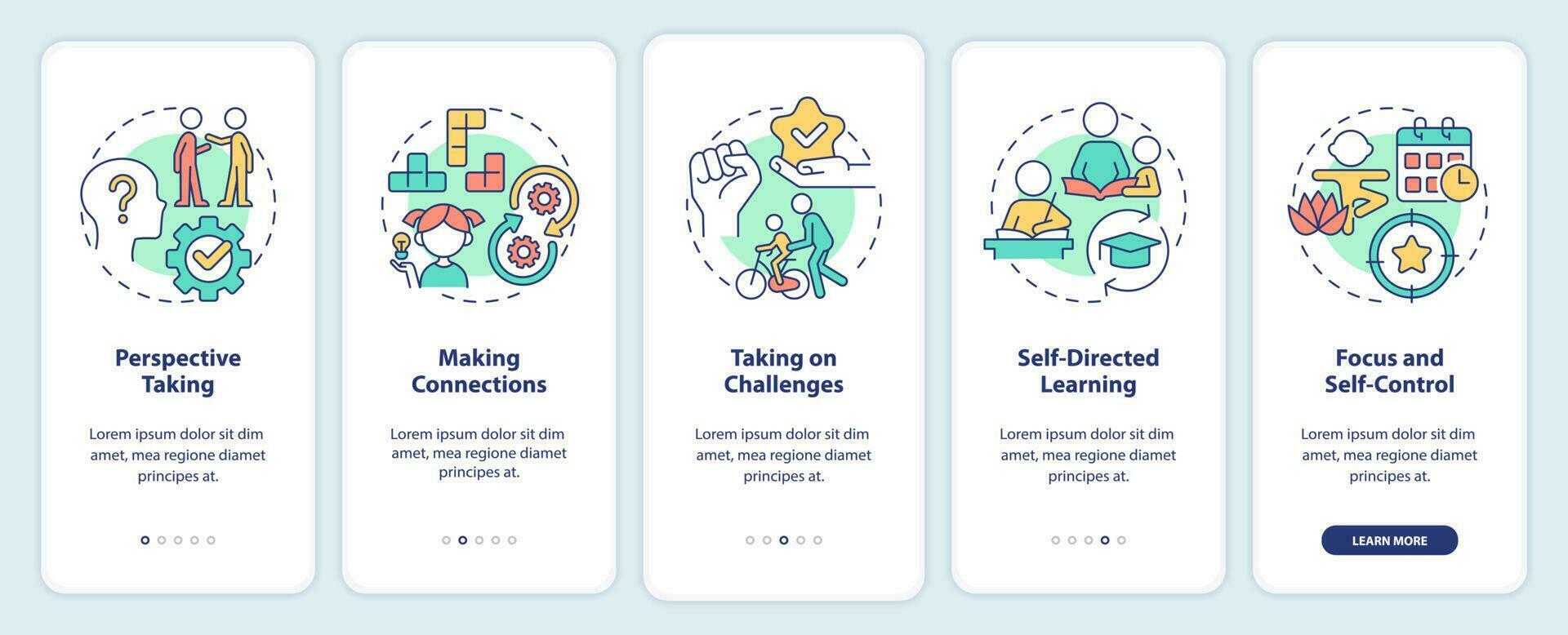 Skills for kids onboarding mobile app screen. Children development walkthrough 5 steps editable graphic instructions with linear concepts. UI, UX, GUI template Pro Vector