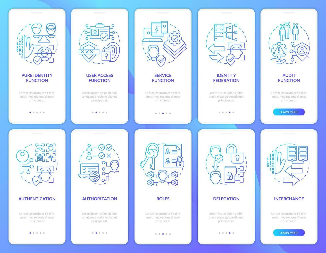 Identity management blue gradient onboarding mobile app screen set. System walkthrough 5 steps graphic instructions with linear concepts. UI, UX, GUI template Pro Vector and Pro SVG