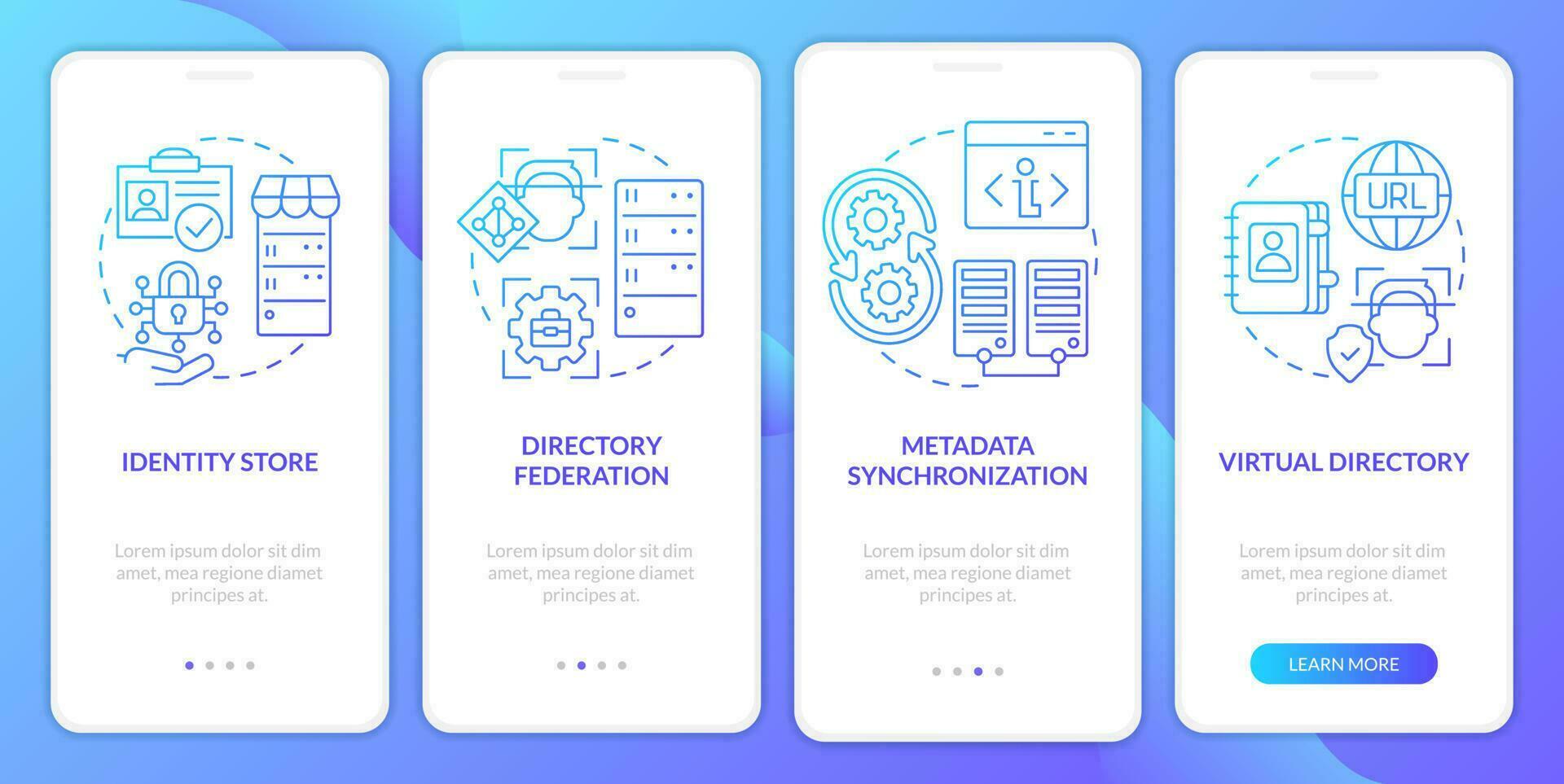 Directory services blue gradient onboarding mobile app screen. Data storage walkthrough 4 steps graphic instructions with linear concepts. UI, UX, GUI template Pro Vector and Pro SVG