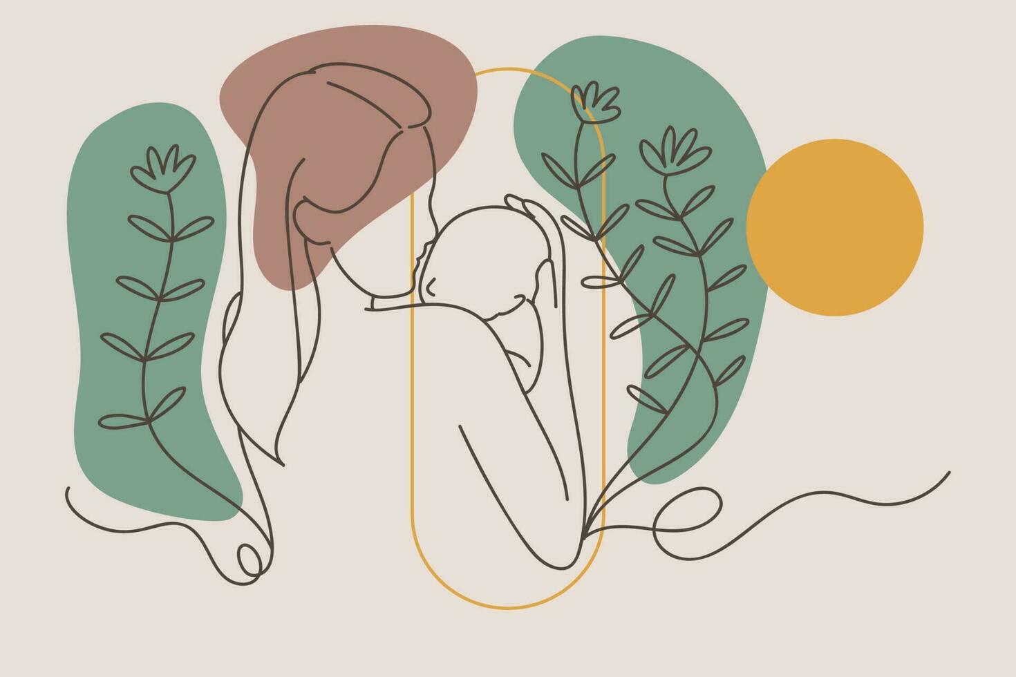Continuous one simple single abstract line drawing of mother and baby in silhouette on a background of leaves. Linear stylized. vector