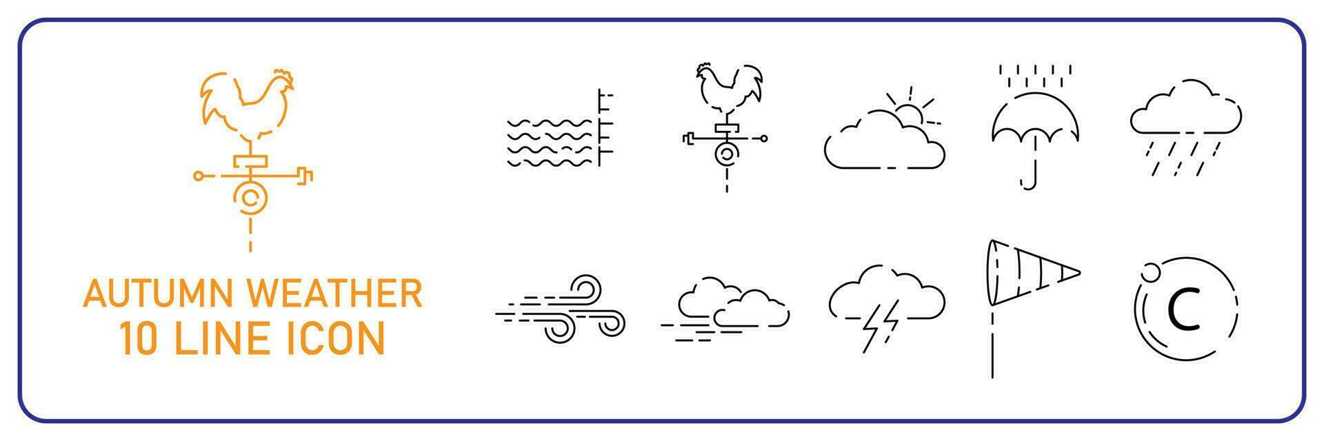 Autumn Weather line icon set. Meteorology vector. Cloud, weather vane rooster, windsock, Celsius, flood and overflow, umbrella or rain, lightning. Pro Vector