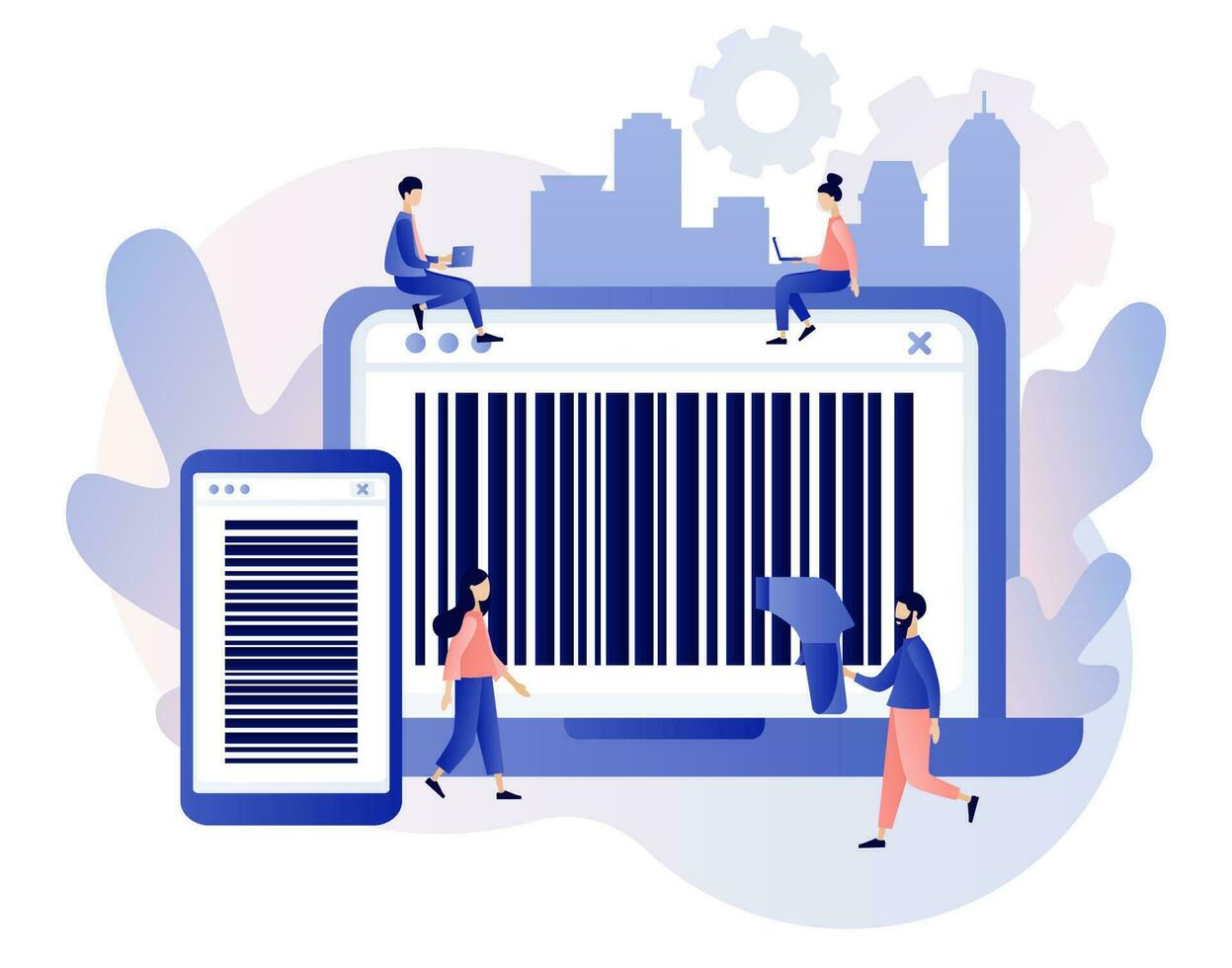 Bar code in smartphone app and laptop screen. Handheld barcode scanner. Tiny people scan bar-code. Modern flat cartoon style. Vector illustration on white background Pro Vector and Pro SVG