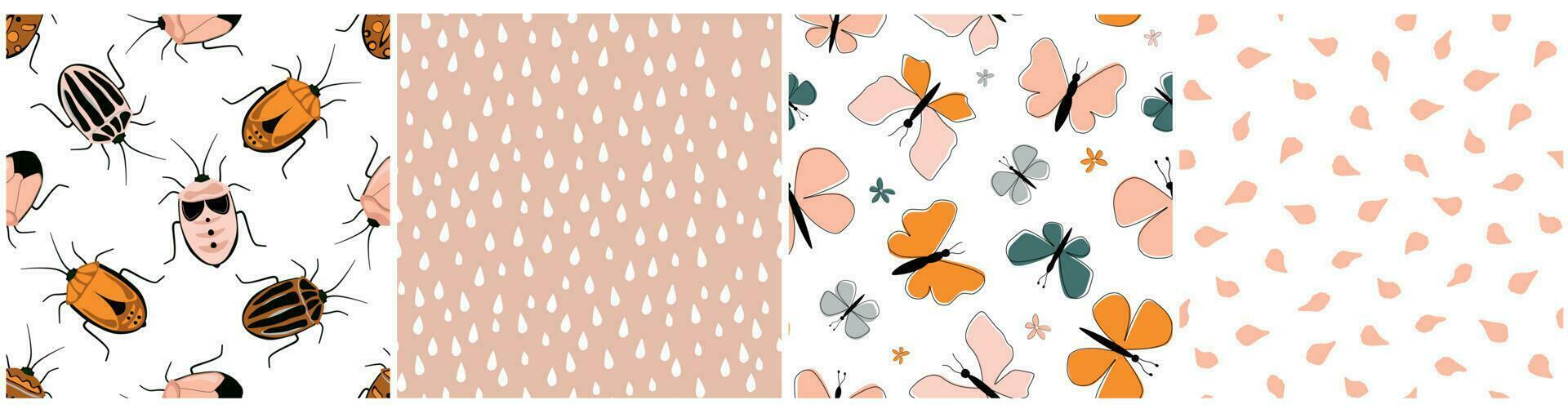 Set of natural patterns with beetles, butterflies and simple elements. Summer ornament with raindrops and petals. Vector graphics. Pro Vector