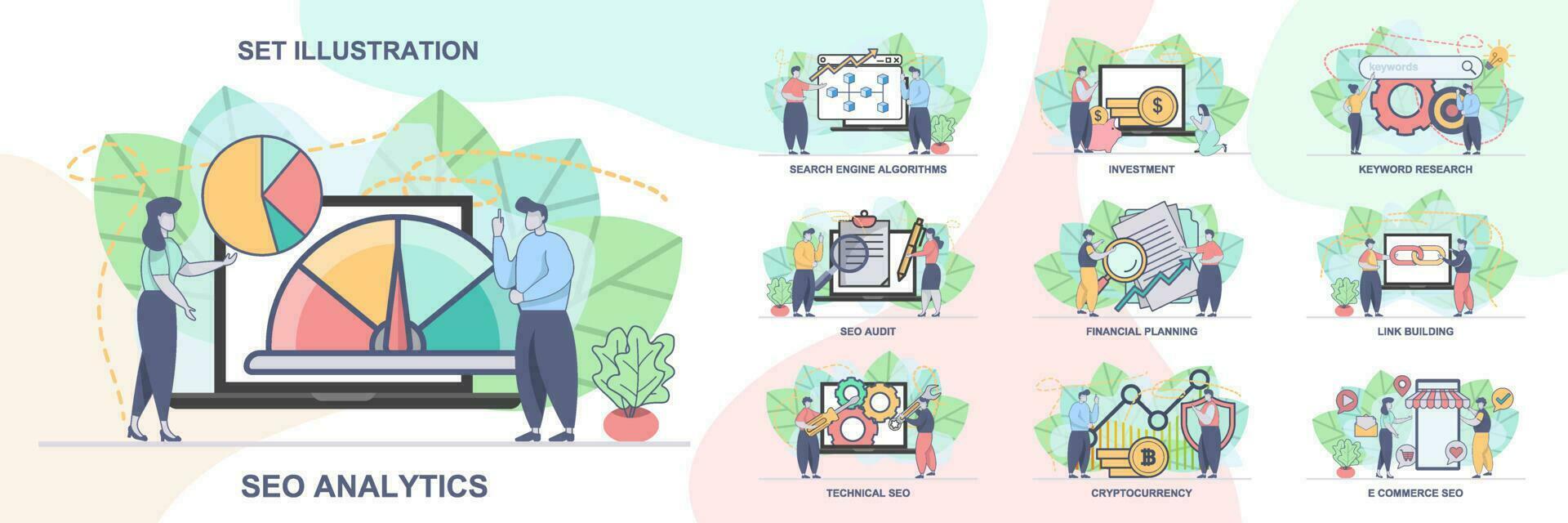 Set of web page design templates for SEO business, SEO Analytics. Technical SEO, SEO Audit web page composition with people characters. Modern vector illustration concepts Pro Vector