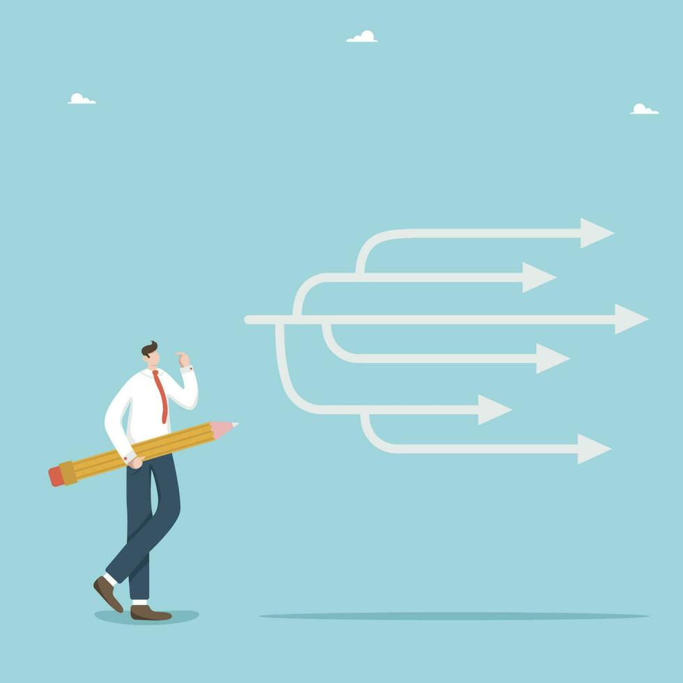 Find a strategy or a way to achieve goals, looking for new opportunities and a way out of a difficult situation, business planning to overcome difficulties, a man with a pencil looks at a path plan. Pro Vector