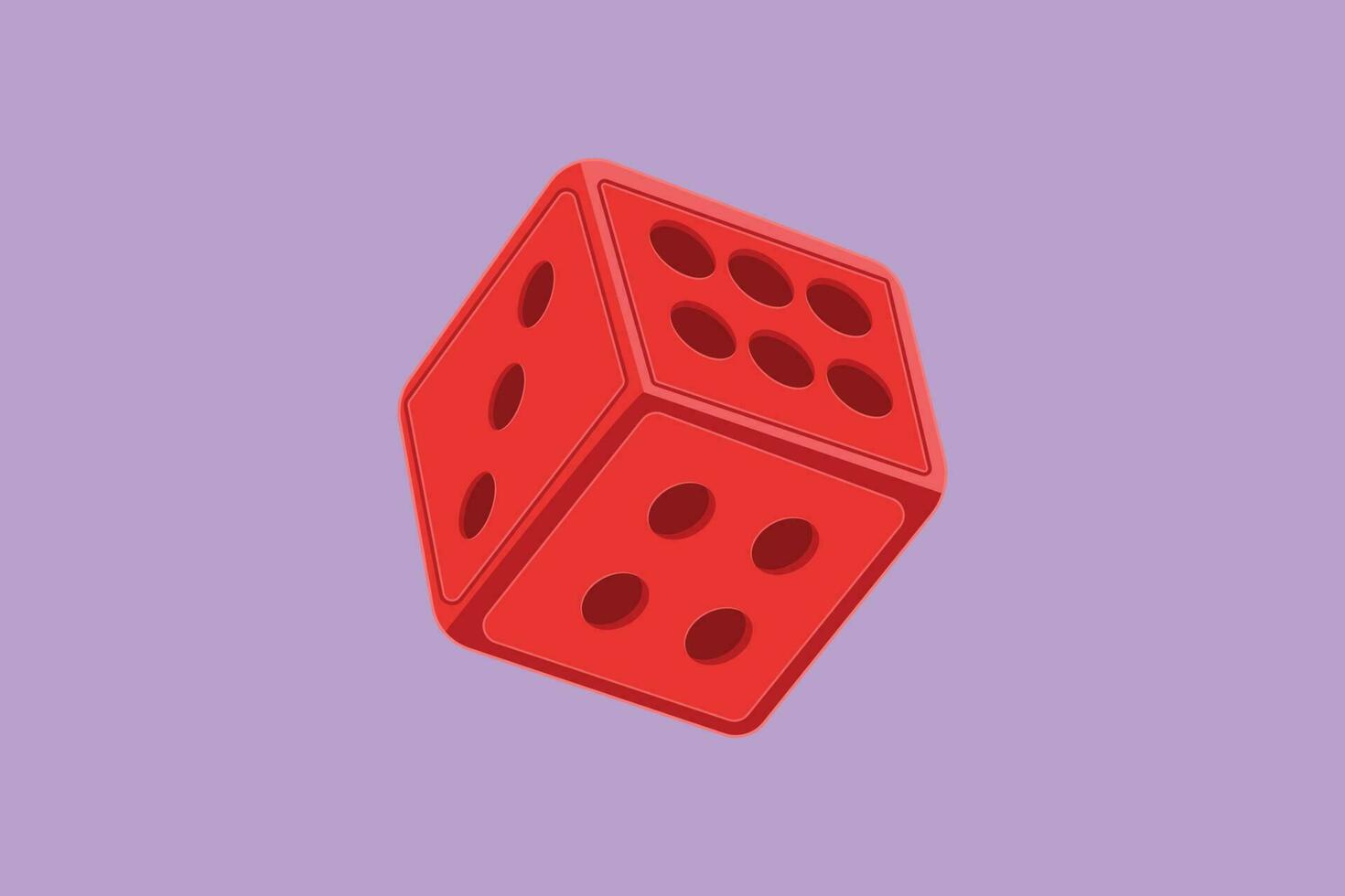 Character flat drawing stylized red dice logo, label, flyer, symbol. Dice with black dots. Dice cube icon, mobile game. Outline cube by black contour for table game. Cartoon design vector illustration Pro Vector