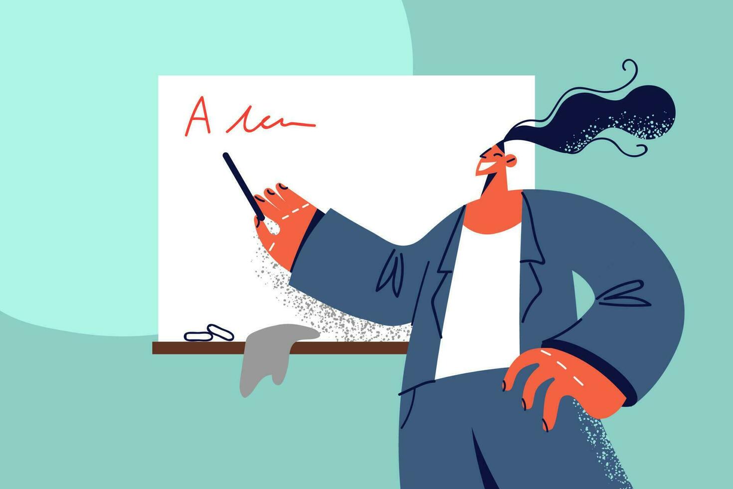 Smiling female teacher with pointer at lesson in classroom. Happy woman tutor explain subject near blackboard at class. Vector illustration. Pro Vector