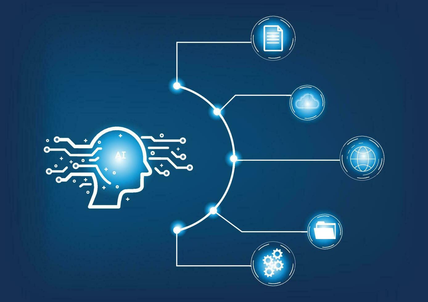 man using technology smart robot, artificial intelligence by enter command prompt for generates something, Artificial intelligence and machine learning concept with icons on blue background. Pro Vector
