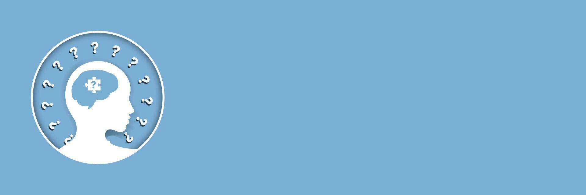 Human Profile surrounded with question marks and brain with puzzle piece. Horizontal Blue mental health background template with copy space. vector