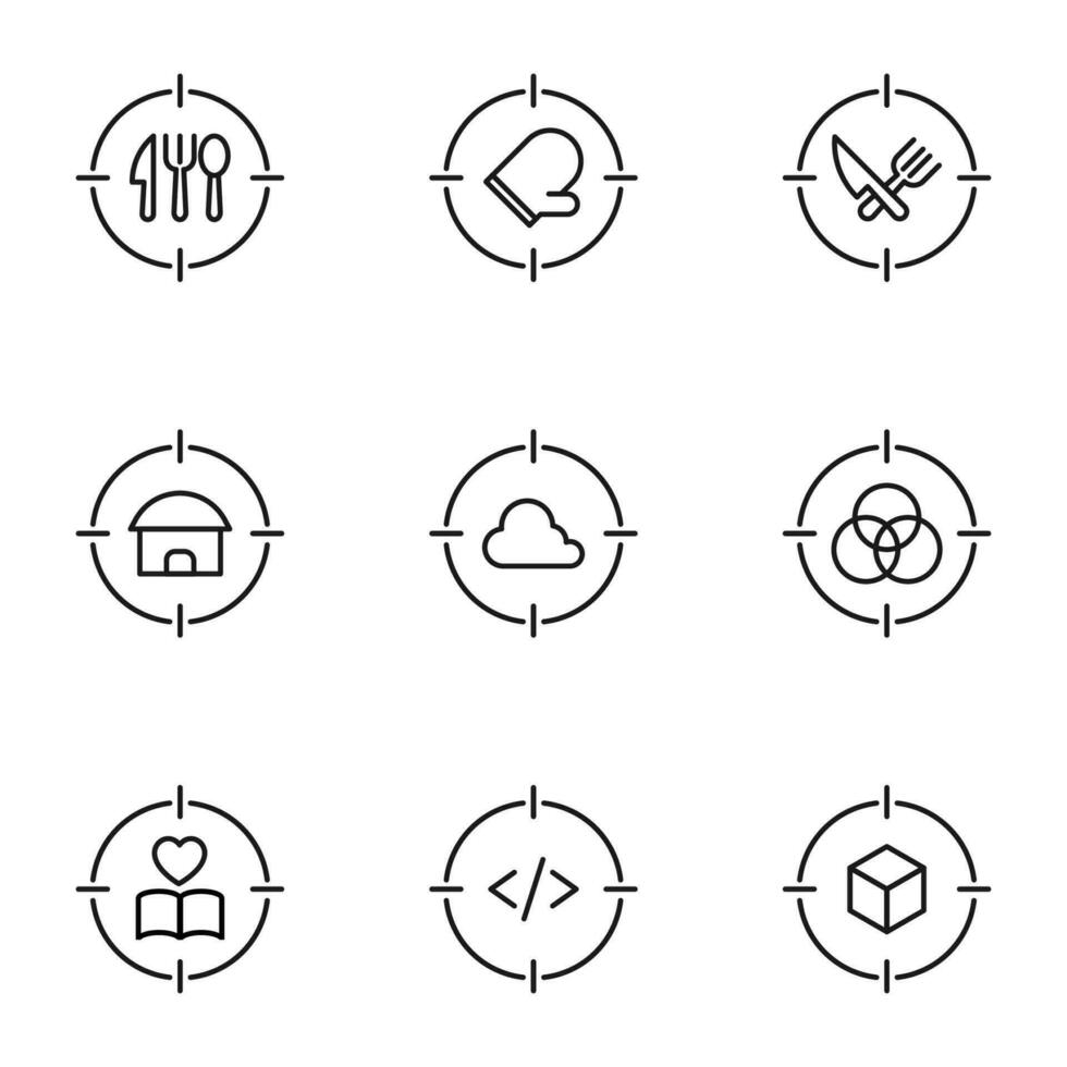 Vector outline signs and symbols drawn in flat style with black thin line. Editable strokes. Line icons of kitchen utensil, mitten, cloud, intersected circles, cube Pro Vector