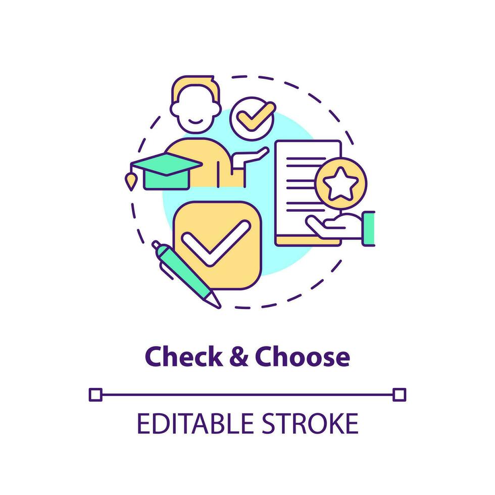 Check and choose concept icon. College education. Tuition assistance. Financial aid. Choose university. Program choice abstract idea thin line illustration. Isolated outline drawing. Editable stroke Pro Vector