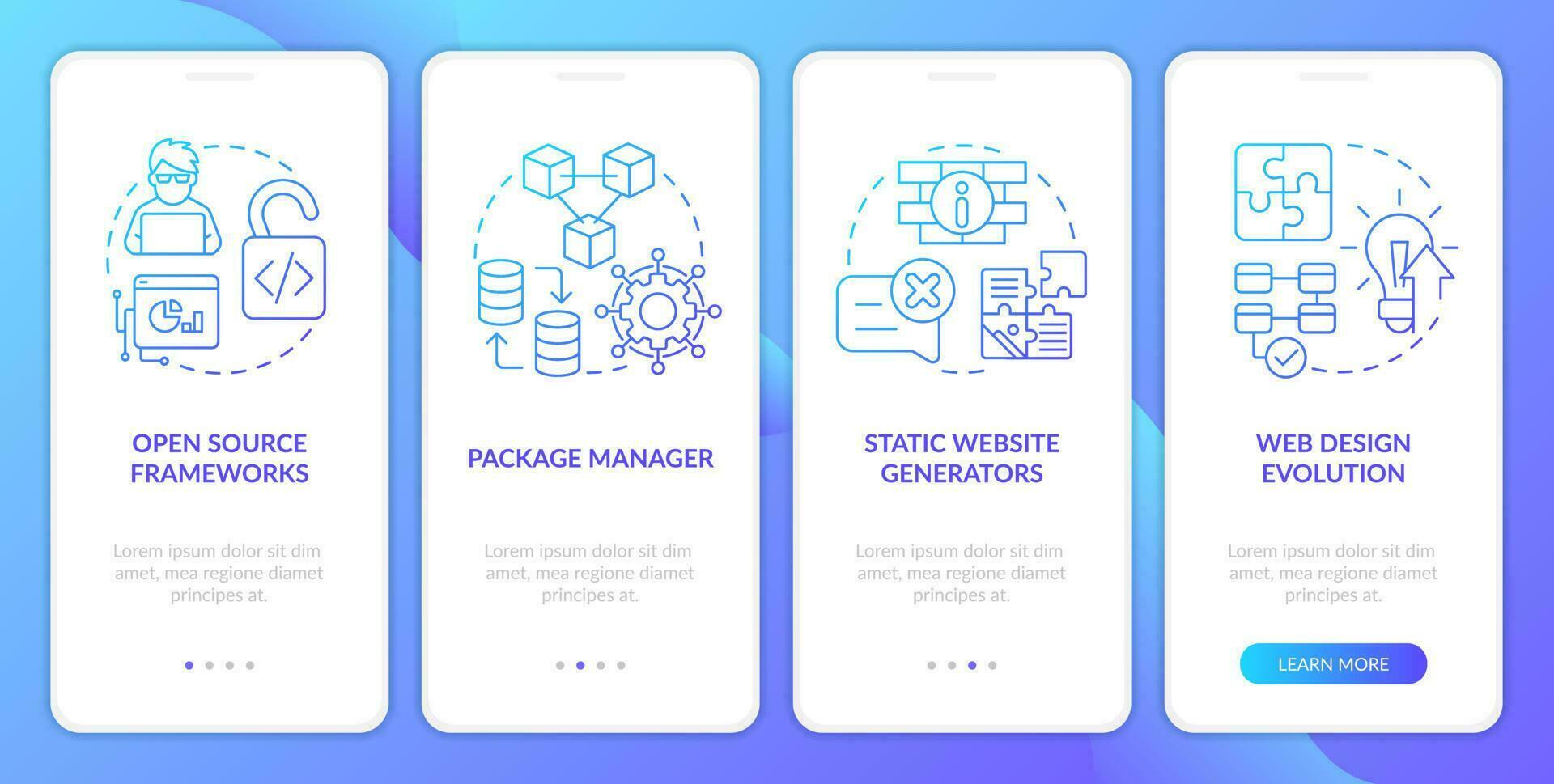 Best trends in digital industry blue gradient onboarding mobile app screen. Walkthrough 4 steps graphic instructions with linear concepts. UI, UX, GUI template Pro Vector and Pro SVG