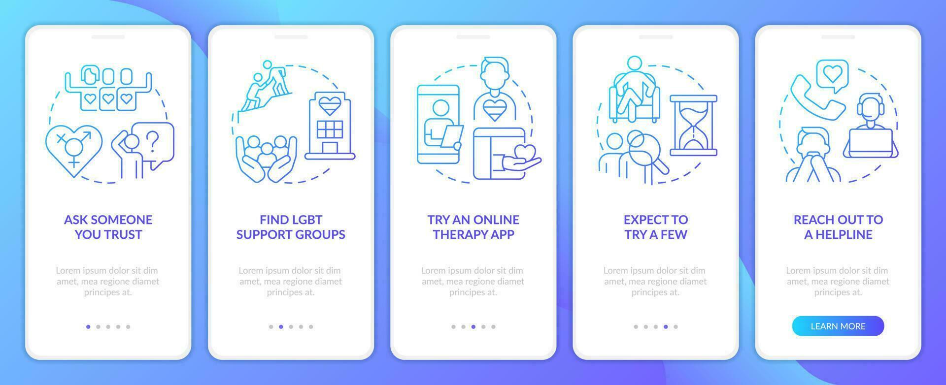 Finding LGBTQ friendly therapist blue gradient onboarding mobile app screen. Walkthrough 5 steps graphic instructions with linear concepts. UI, UX, GUI template Pro Vector and Pro SVG