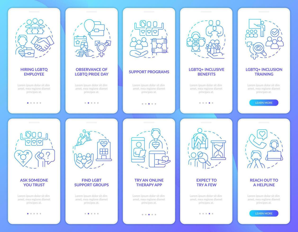 LGBTQI workplace and therapist blue gradient onboarding mobile app screens set. Walkthrough 5 steps graphic instructions with linear concepts. UI, UX, GUI template Pro Vector and Pro SVG