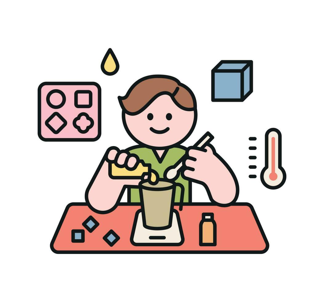 One day class workshop. People are learning new skills. Illustration of geometric design. Soap making workshop. Pro Vector