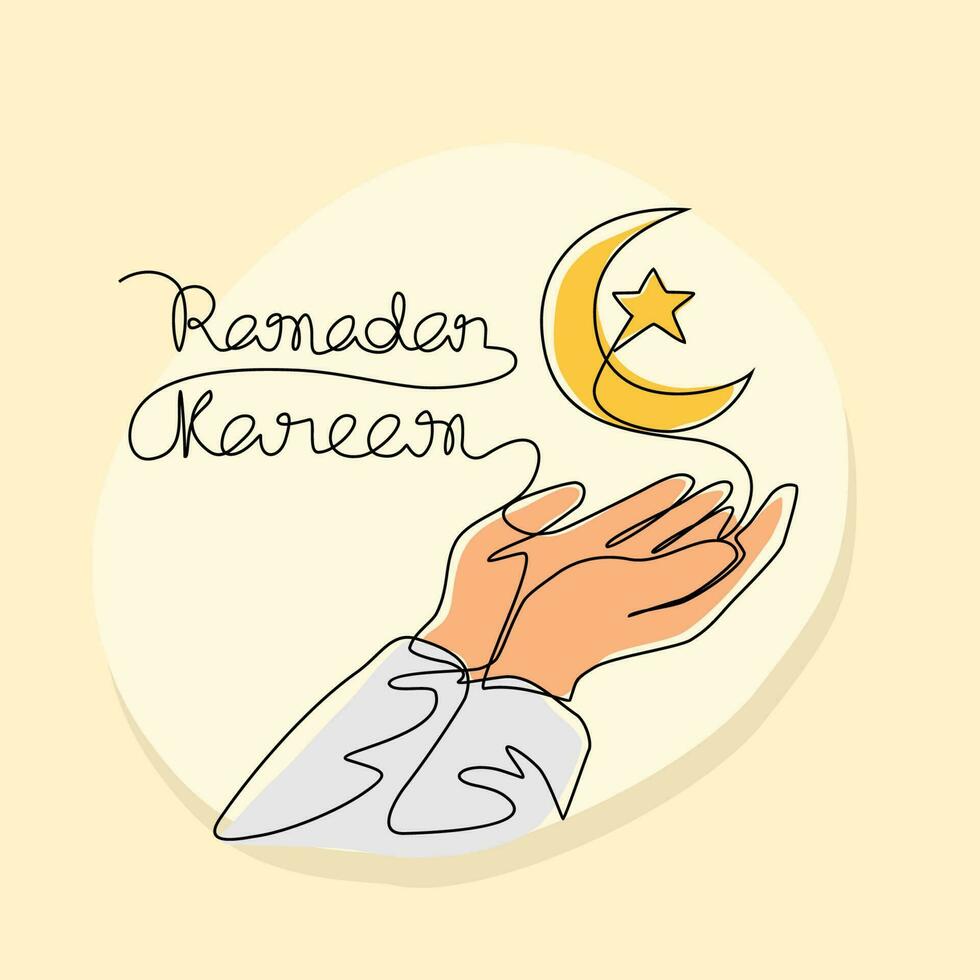 One continuous line drawing of hand and a half moon for symbol ramadan kareem.  ramadan design concept with simple linear style. islamic design concept. vector