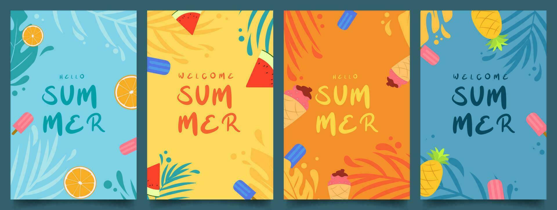 set simple flat vertical summer splash design with leaf, ice cream, watermelon, pineapple and lemon background vector illustration EPS10 Pro Vector