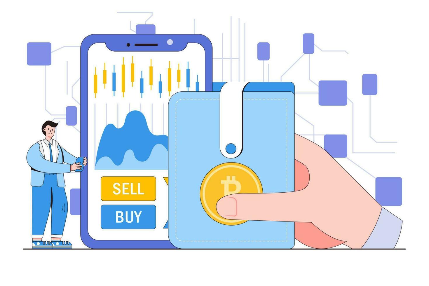 Cryptocurrency and Blockchain Technology Concept with a Person Trading Cryptocurrencies and Managing a Digital Wallet Pro Vector
