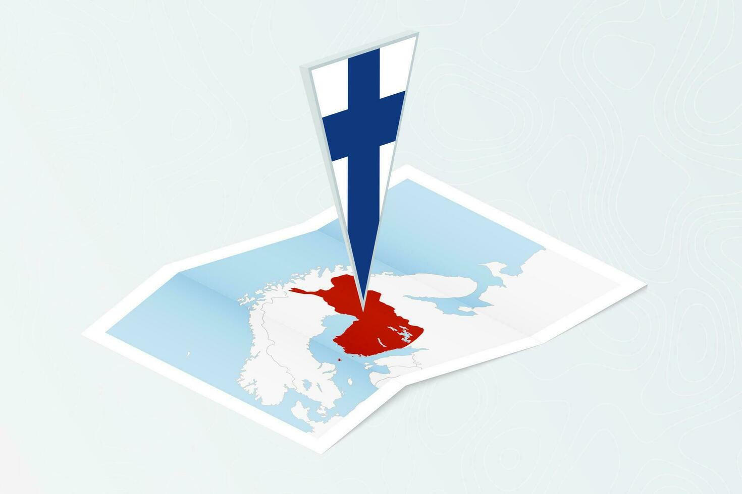 Isometric paper map of Finland with triangular flag of Finland in isometric style. Map on topographic background. Pro Vector