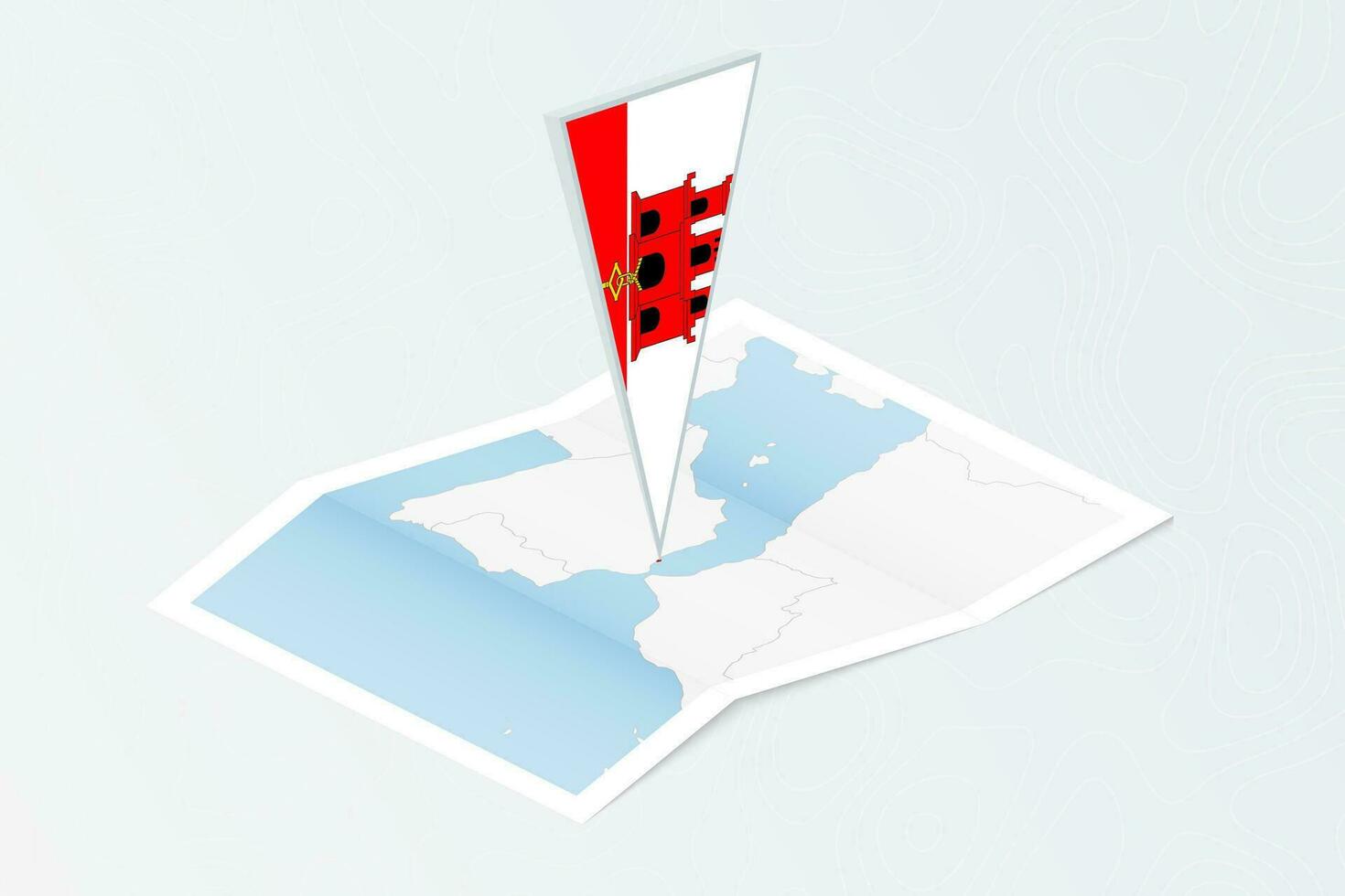 Isometric paper map of Gibraltar with triangular flag of Gibraltar in isometric style. Map on topographic background. Pro Vector