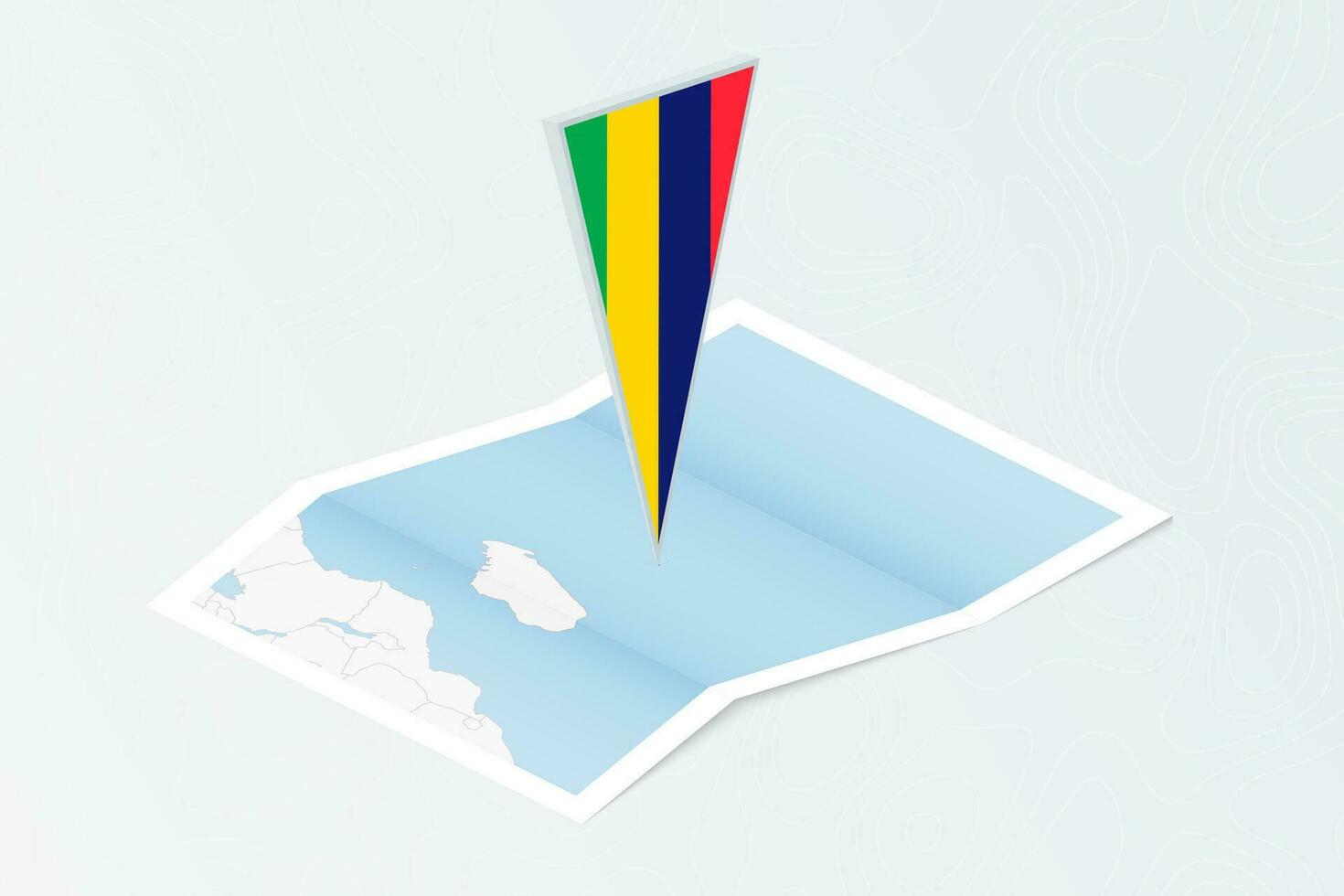 Isometric paper map of Mauritius with triangular flag of Mauritius in isometric style. Map on topographic background. Pro Vector