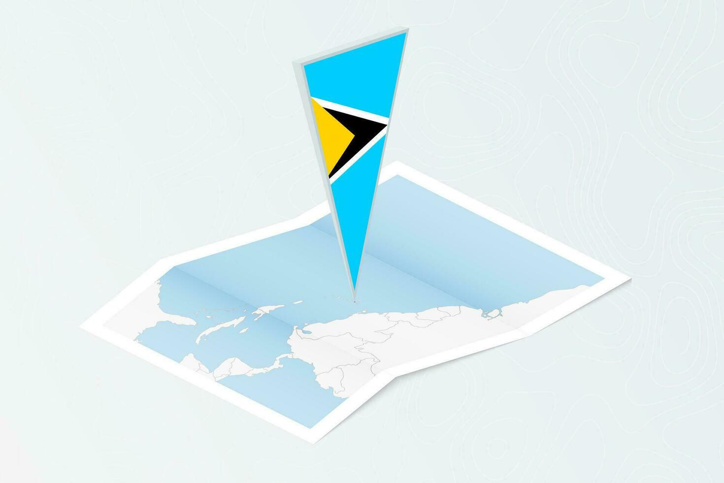 Isometric paper map of Saint Lucia with triangular flag of Saint Lucia in isometric style. Map on topographic background. Pro Vector