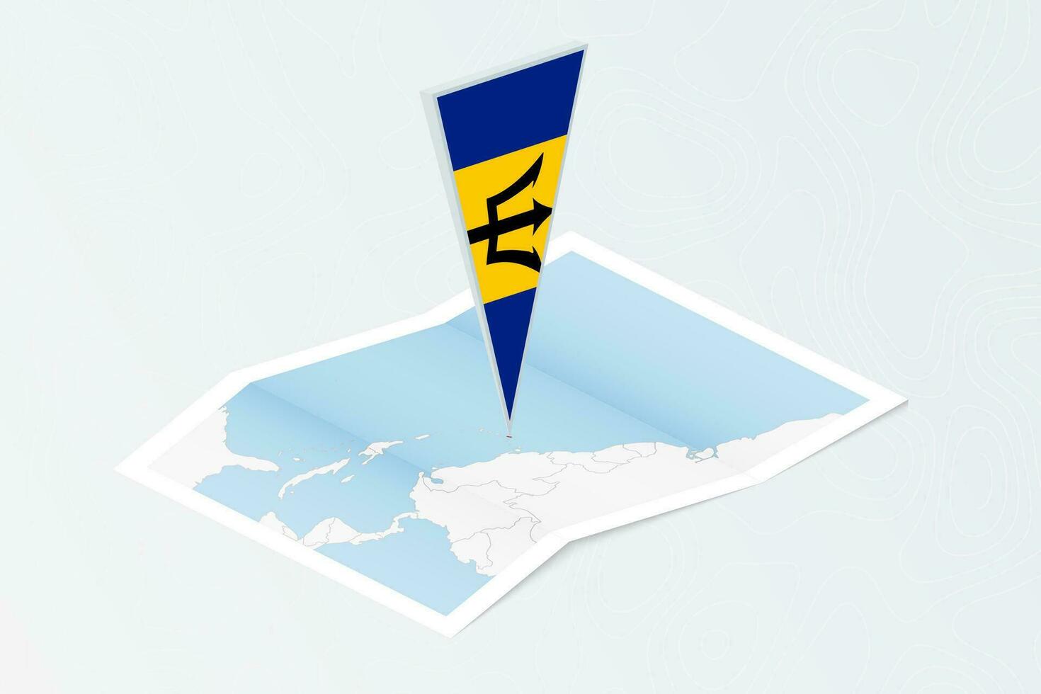 Isometric paper map of Barbados with triangular flag of Barbados in isometric style. Map on topographic background. Pro Vector