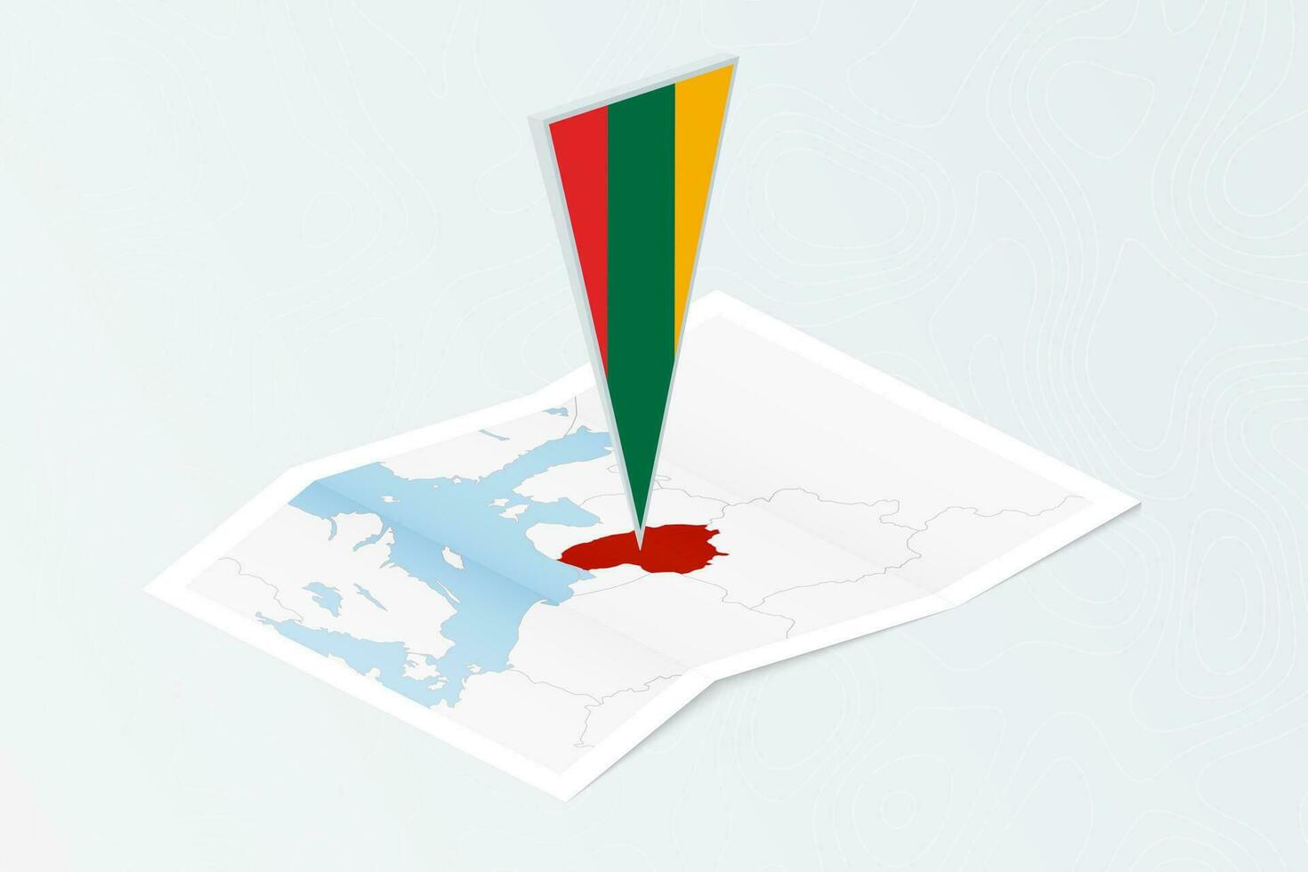 Isometric paper map of Lithuania with triangular flag of Lithuania in isometric style. Map on topographic background. Pro Vector