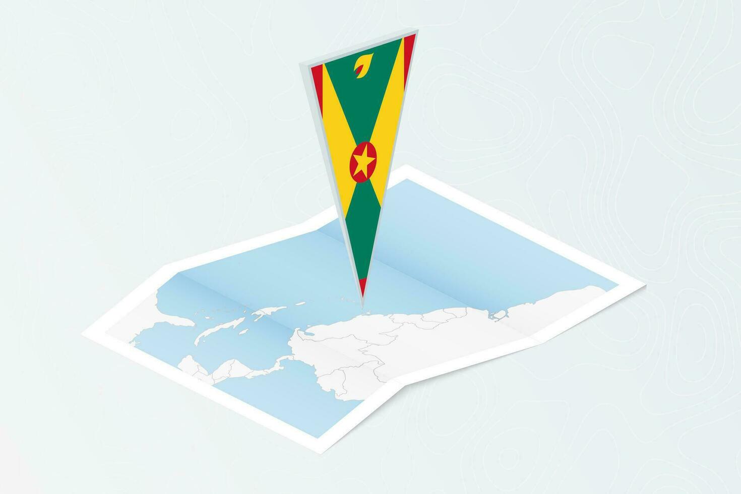 Isometric paper map of Grenada with triangular flag of Grenada in isometric style. Map on topographic background. Pro Vector