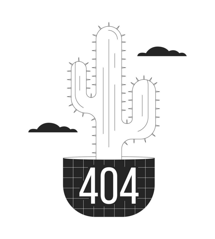 Cactus in clouds black white error 404 flash message. Potted desert flower. Cacti plant. Monochrome empty state ui design. Page not found popup cartoon image. Vector flat outline illustration concept Pro Vector