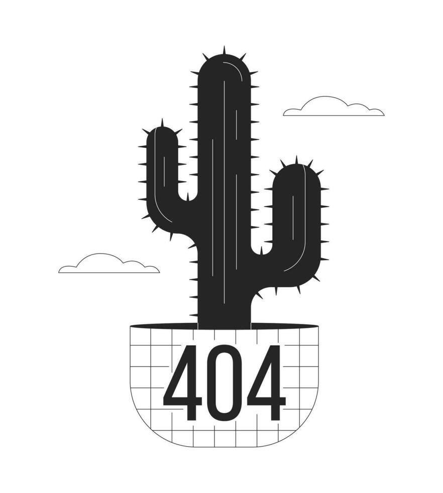 Potted cactus plant in clouds black white error 404 flash message. Wild west. Houseplant. Monochrome empty state ui design. Page not found popup cartoon image. Vector flat outline illustration concept Pro Vector