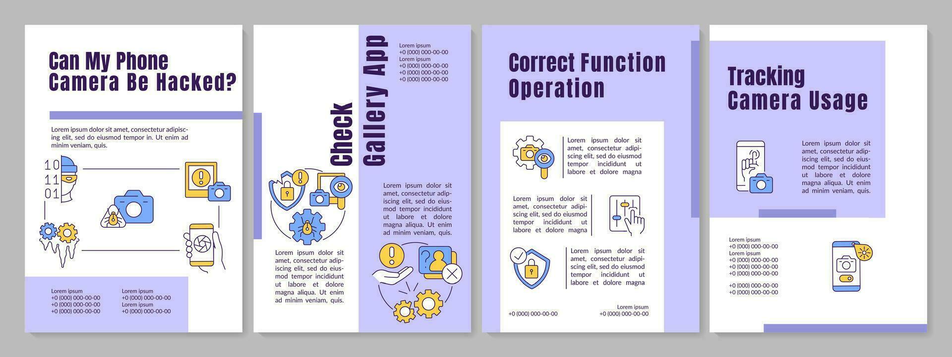 Smartphone camera security purple brochure template. Prevent hacker attack. Leaflet design with linear icons. Editable 4 vector layouts for presentation, annual reports Pro Vector