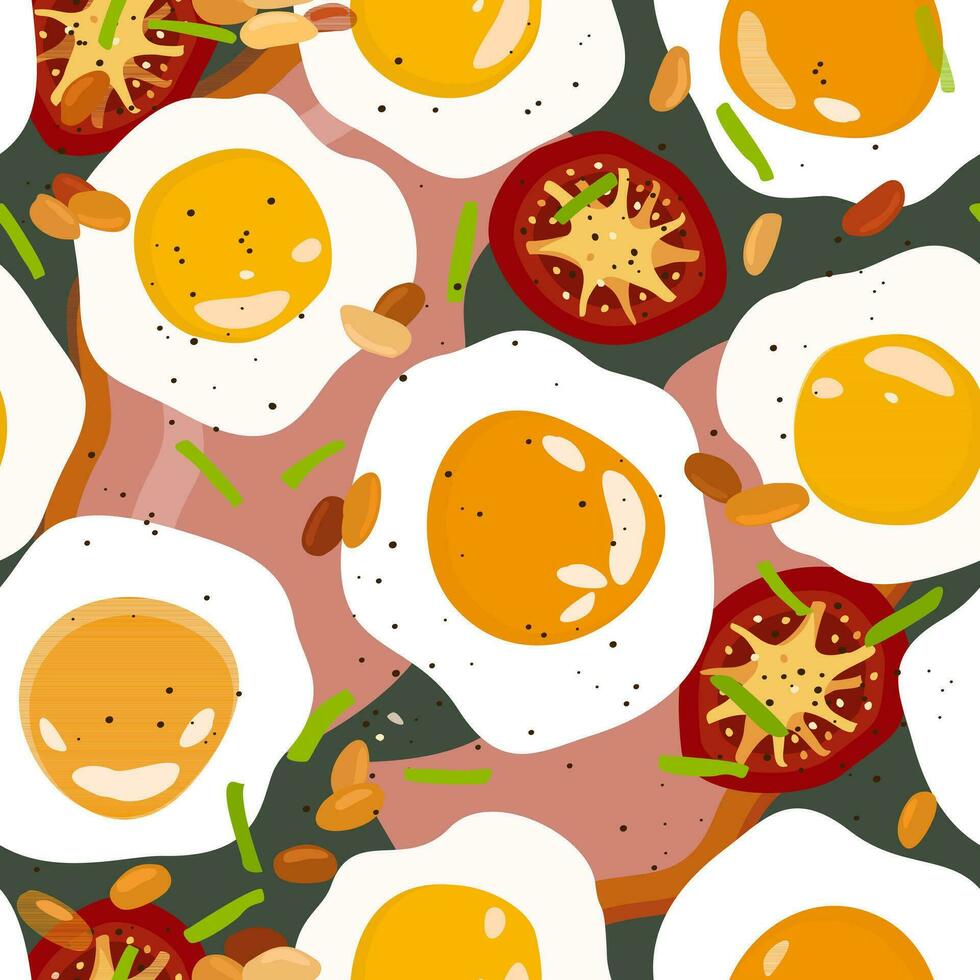Vector seamless pattern with fried eggs, tomatoes, slices of ham and beans. Pro Vector