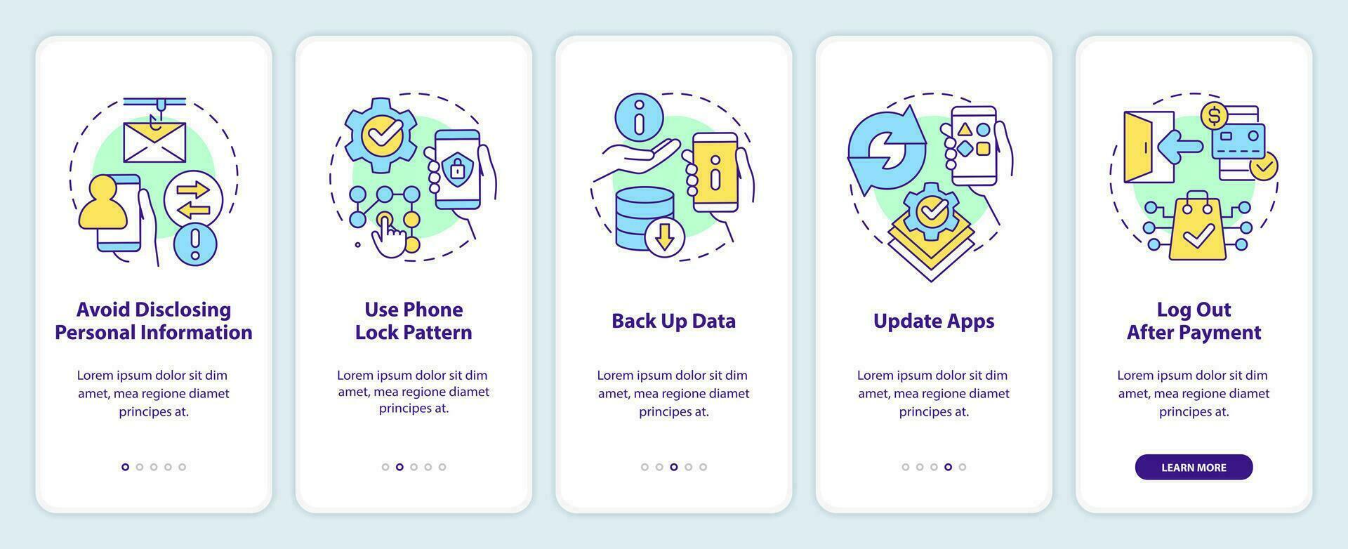 Tips to keep your smartphone secure onboarding mobile app screen. Walkthrough 5 steps editable graphic instructions with linear concepts. UI, UX, GUI template Pro Vector
