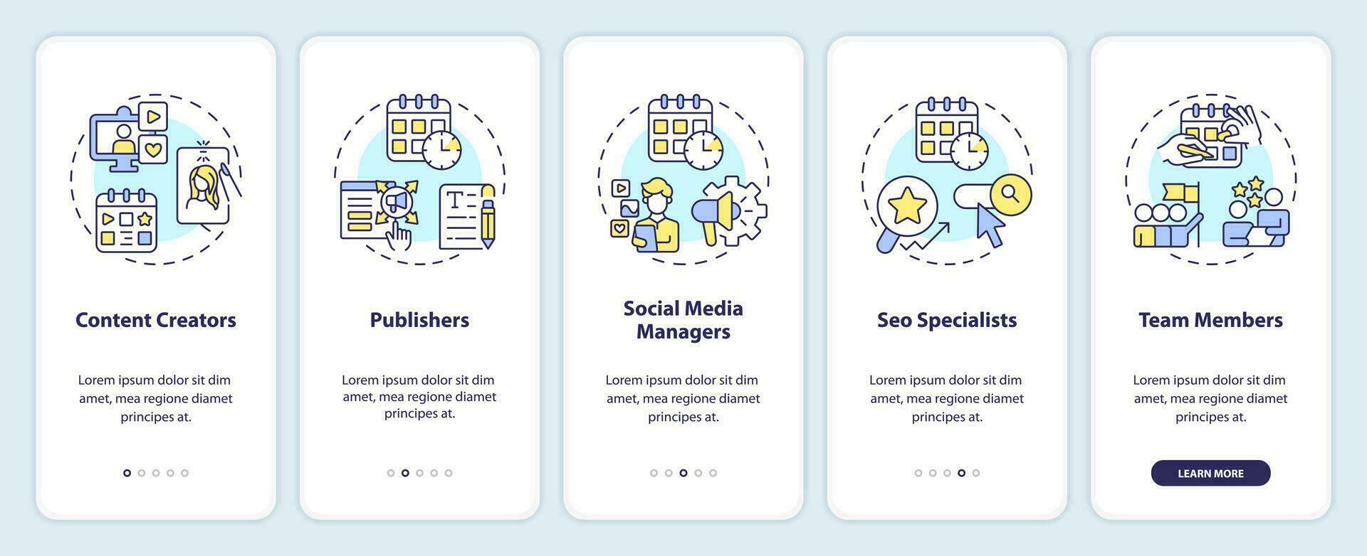 Who can use editorial calendar onboarding mobile app screen. Walkthrough 5 steps editable graphic instructions with linear concepts. UI, UX, GUI template Pro Vector