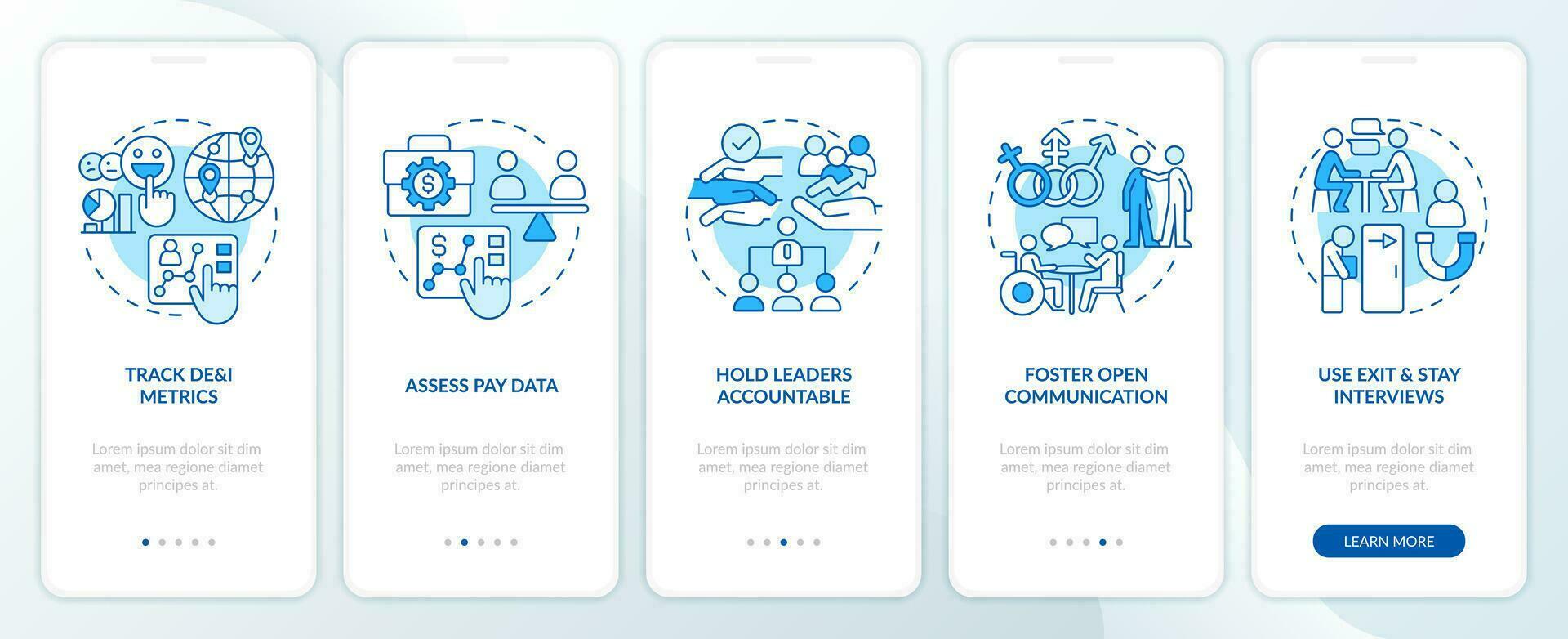 Making DEI efforts practices blue onboarding mobile app screen. Walkthrough 5 steps editable graphic instructions with linear concepts. UI, UX, GUI template Pro Vector and Pro SVG