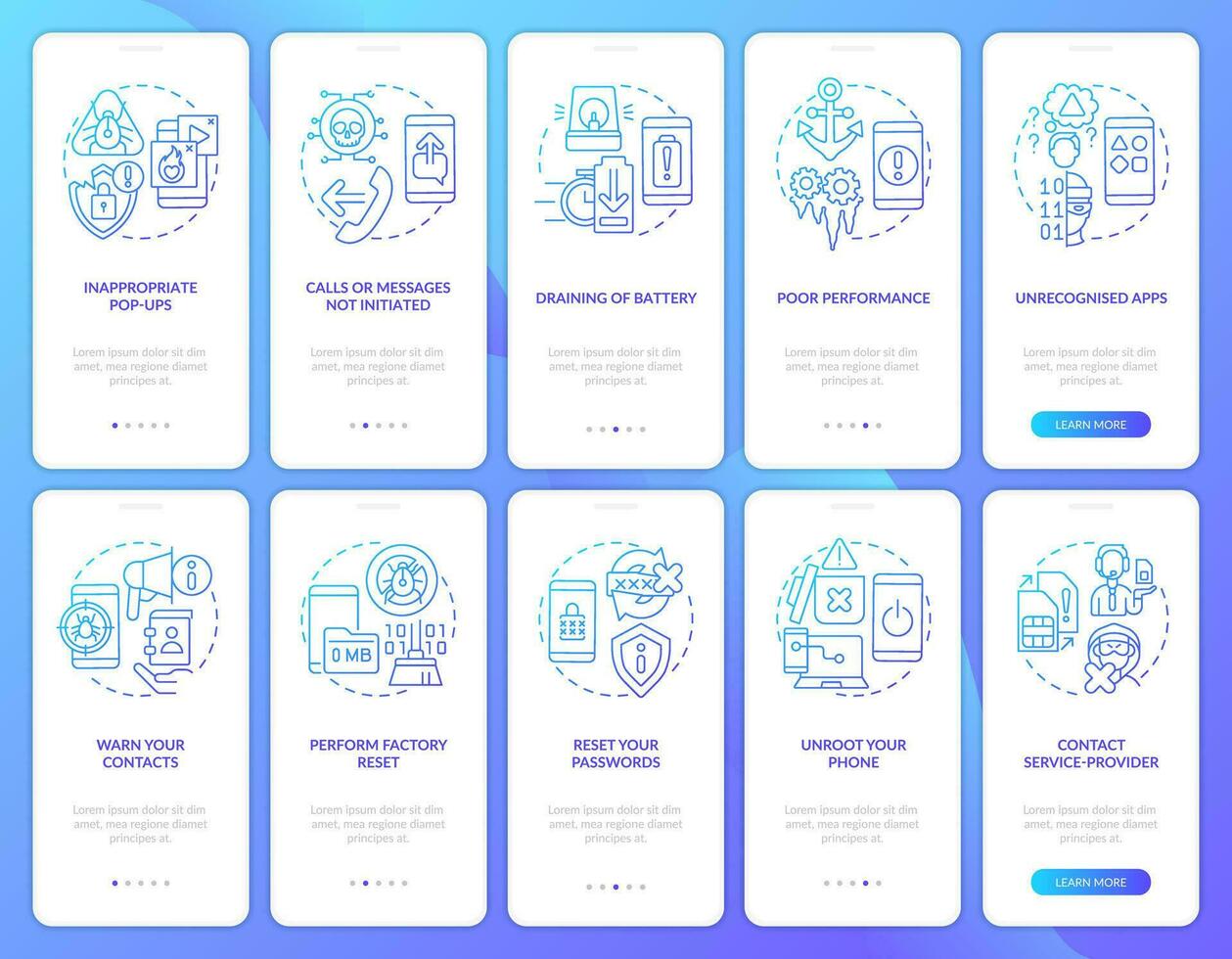 Mobile phone hacking attack blue gradient onboarding mobile app screen set. Walkthrough 5 steps graphic instructions with linear concepts. UI, UX, GUI template Pro Vector and Pro SVG