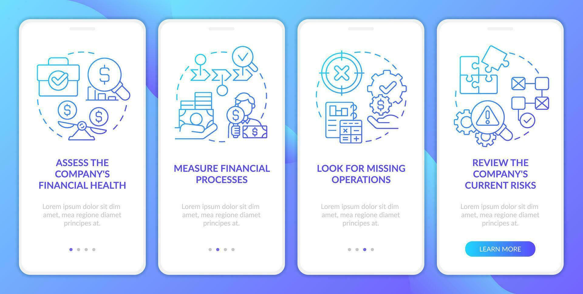 Determine treasury management need blue gradient onboarding mobile app screen. Walkthrough 4 steps graphic instructions with linear concepts. UI, UX, GUI template Pro Vector and Pro SVG