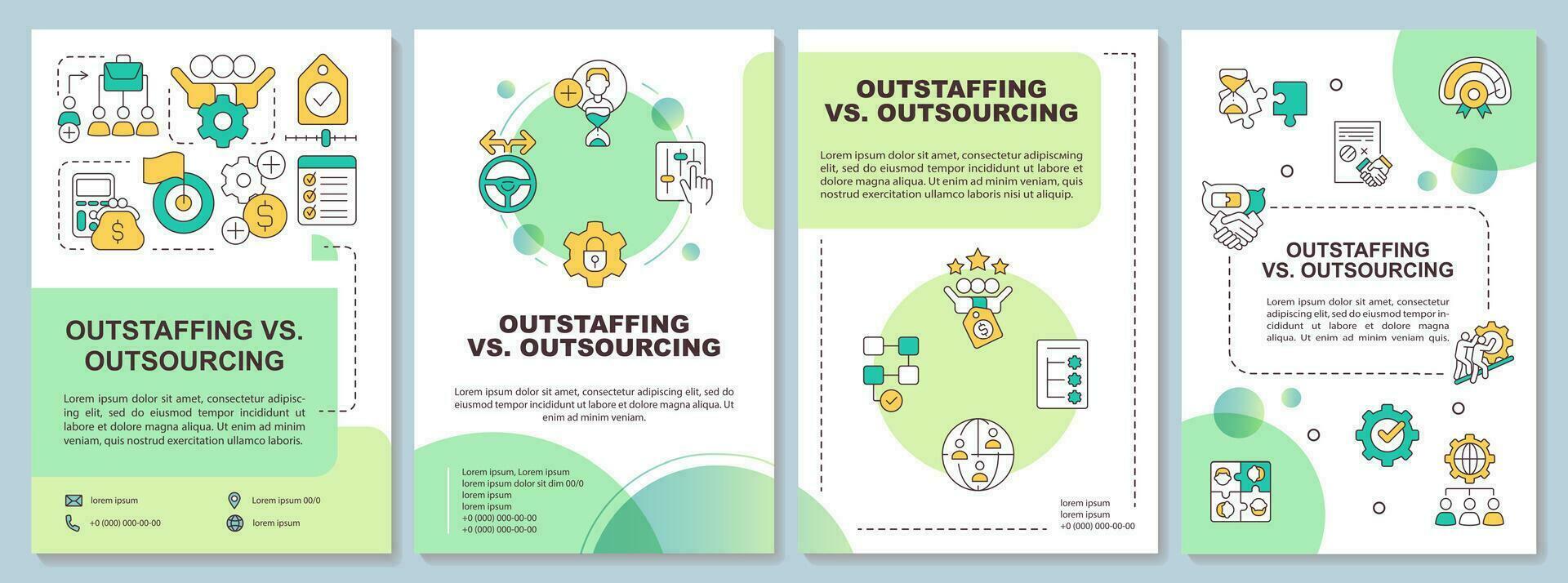 Outstaffing and outsourcing difference green brochure template. Leaflet design with linear icons. Editable 4 vector layouts for presentation, annual reports Pro Vector