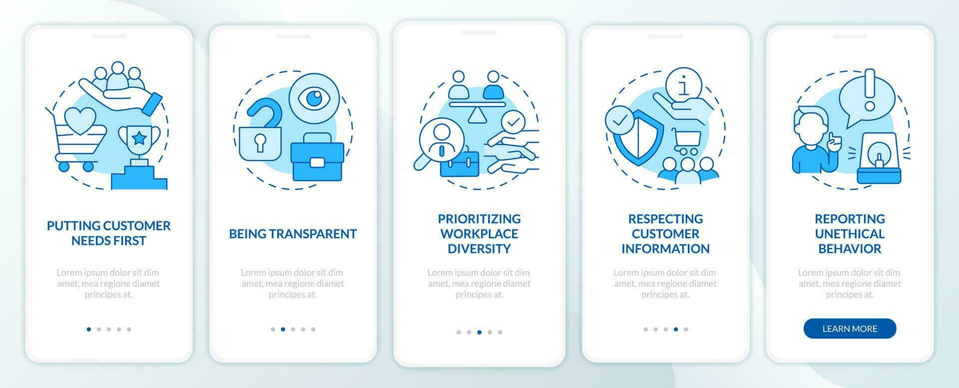 Ethics in customer dealings blue onboarding mobile app screen. Walkthrough 5 steps editable graphic instructions with linear concepts. UI, UX, GUI template Pro Vector and Pro SVG