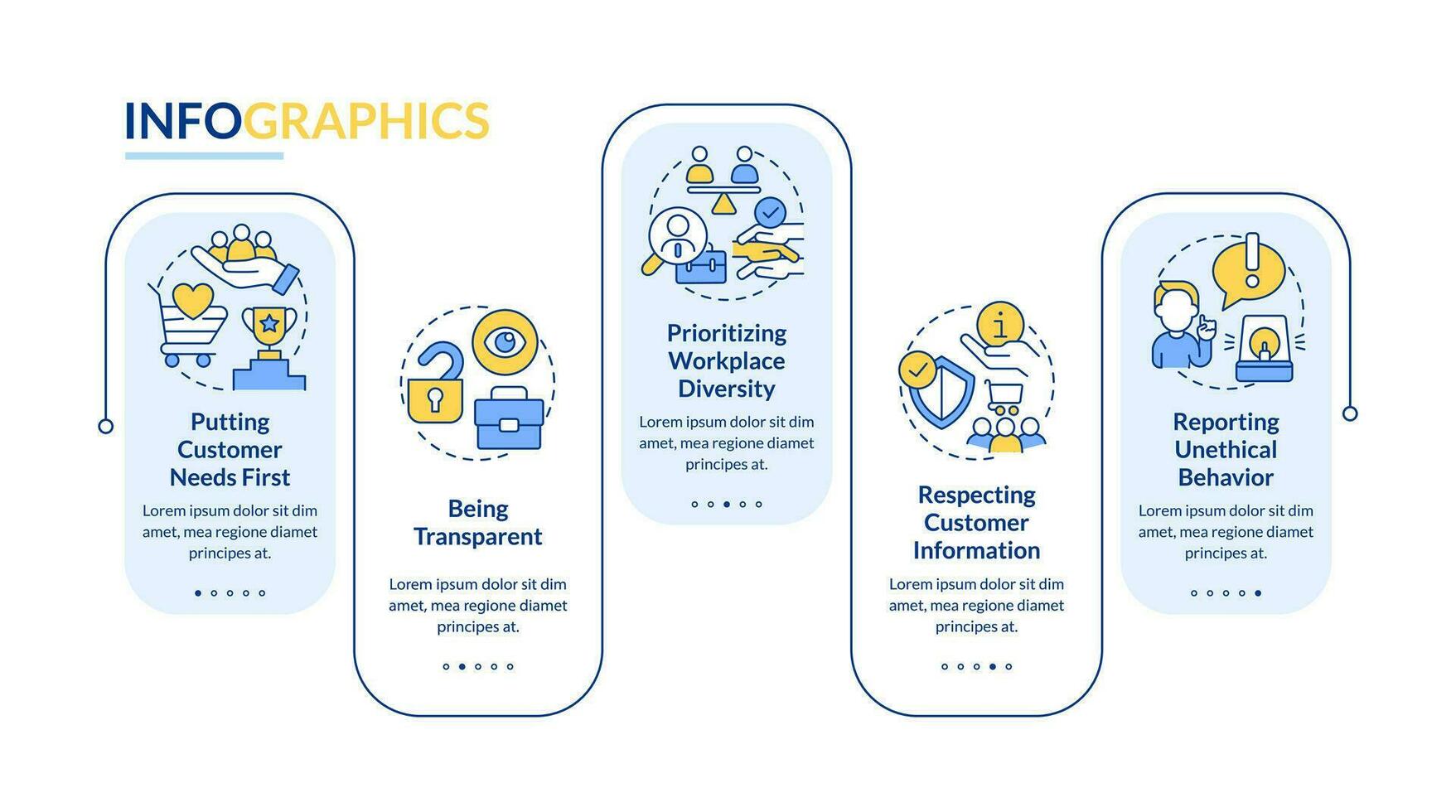 Ethics in customer dealings rectangle infographic template. Needs first. Data visualization with 5 steps. Editable timeline info chart. Workflow layout with line icons Pro Vector