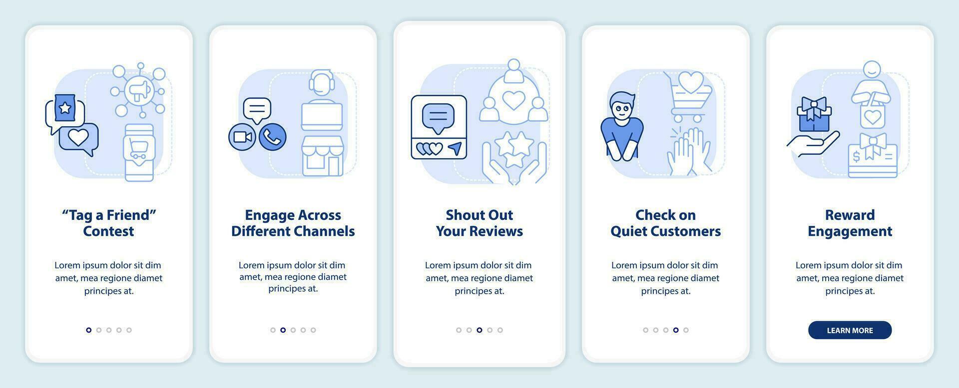 Customer engagement strategies light blue onboarding mobile app screen. Walkthrough 5 steps editable graphic instructions with linear concept. UI, UX, GUI template Pro Vector