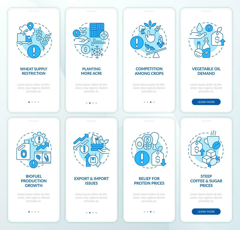 Farming challenges blue onboarding mobile app screen set. Agriculture walkthrough 4 steps editable graphic instructions with linear concepts. UI, UX, GUI templated Pro Vector