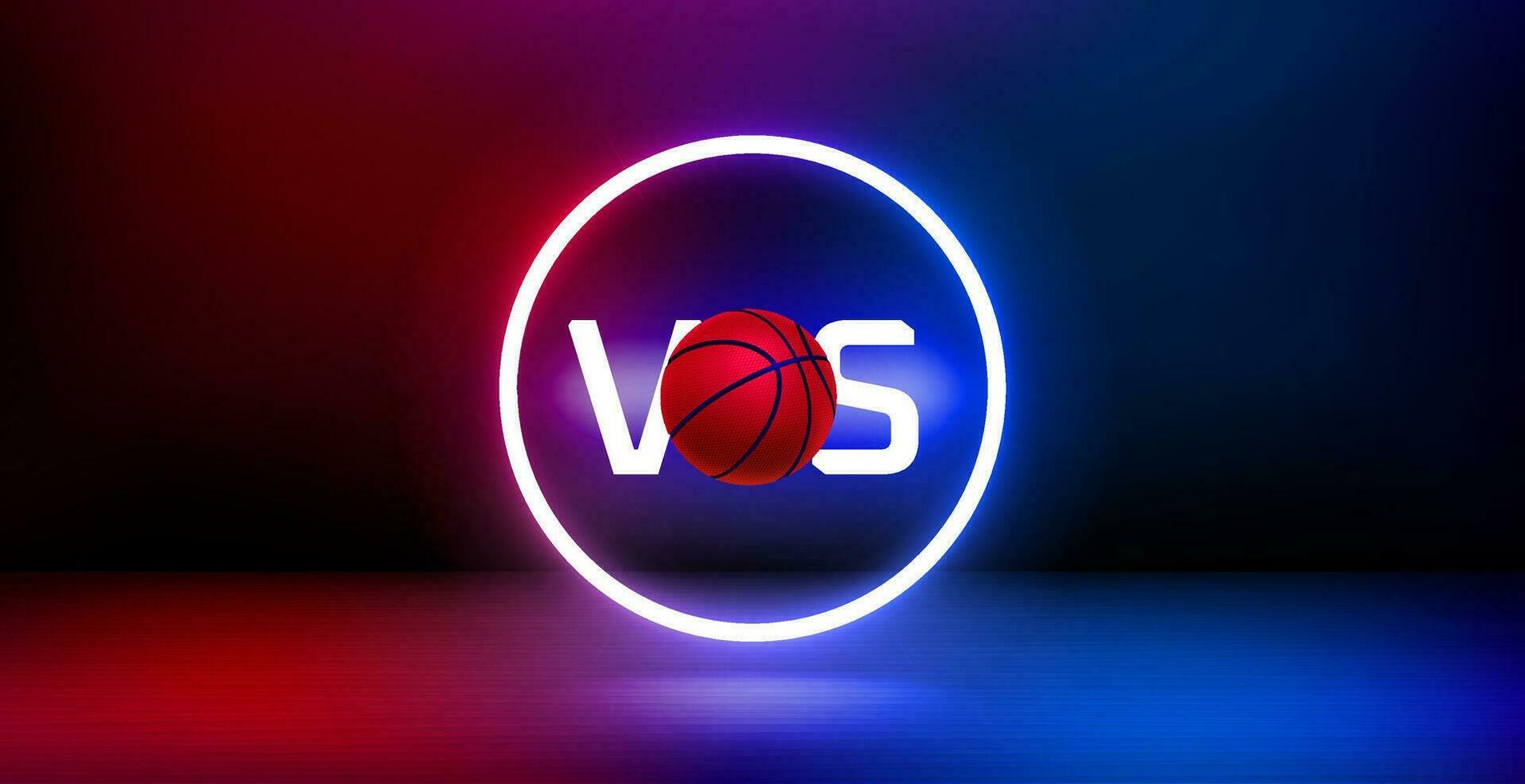Showcase and shining neon frame and basketball versus concept. 3d vector banner with copy space Pro Vector