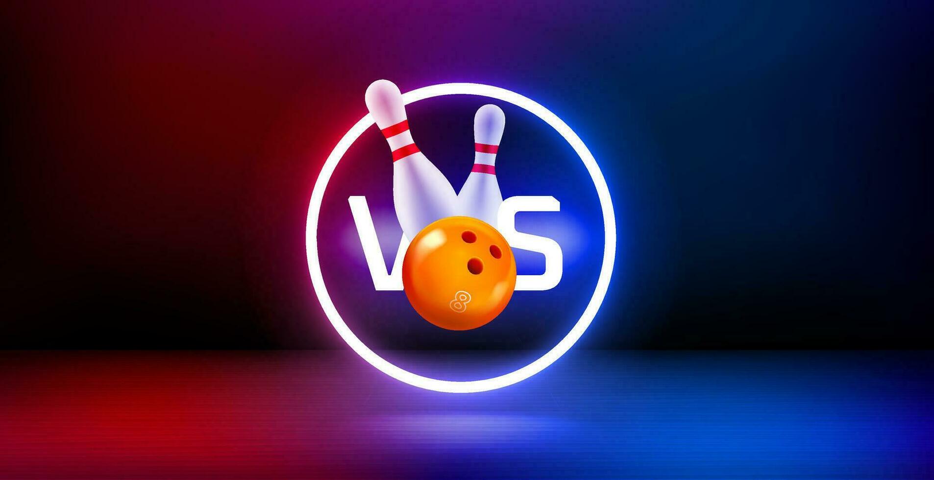 Showcase and shining neon frame and bowling battle concept. 3d vector banner with copy space Pro Vector