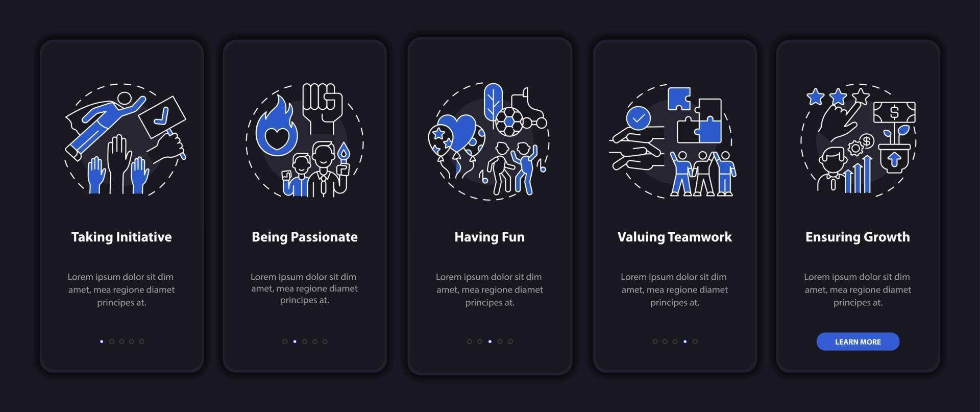 Main company core values onboarding mobile app page screen with concepts Pro Vector
