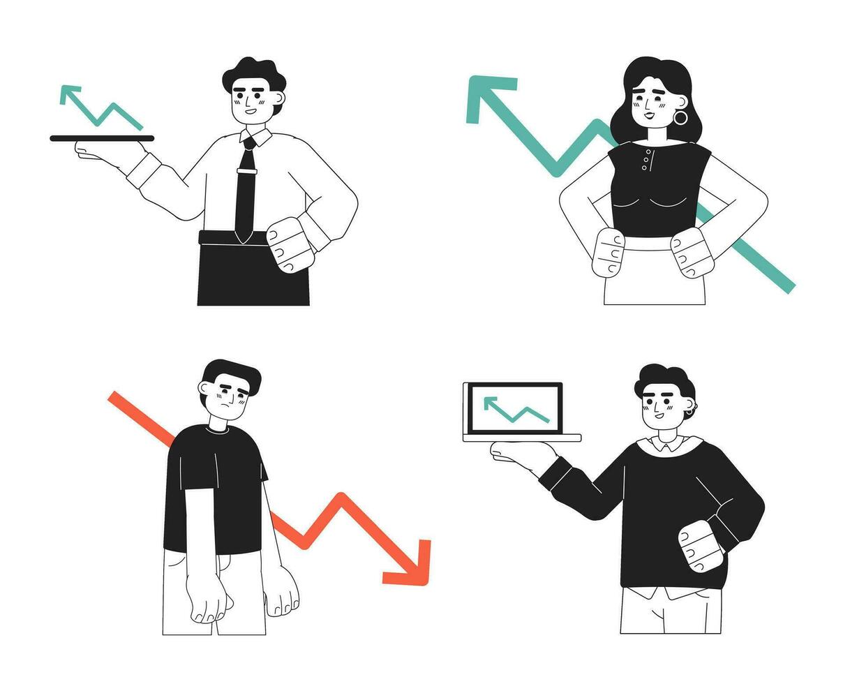 Young perspective monochromatic flat vector characters pack. Editable thin line body investing characters with diagrams progress on white. Simple bw cartoon spot images set for web graphic design Pro Vector