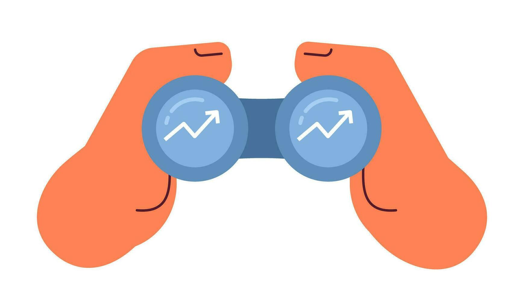 Looking on diagram through binoculars semi flat colour vector object. Hand hold binoculars. Editable cartoon clip art icon on white background. Simple spot illustration for web graphic design Pro Vector
